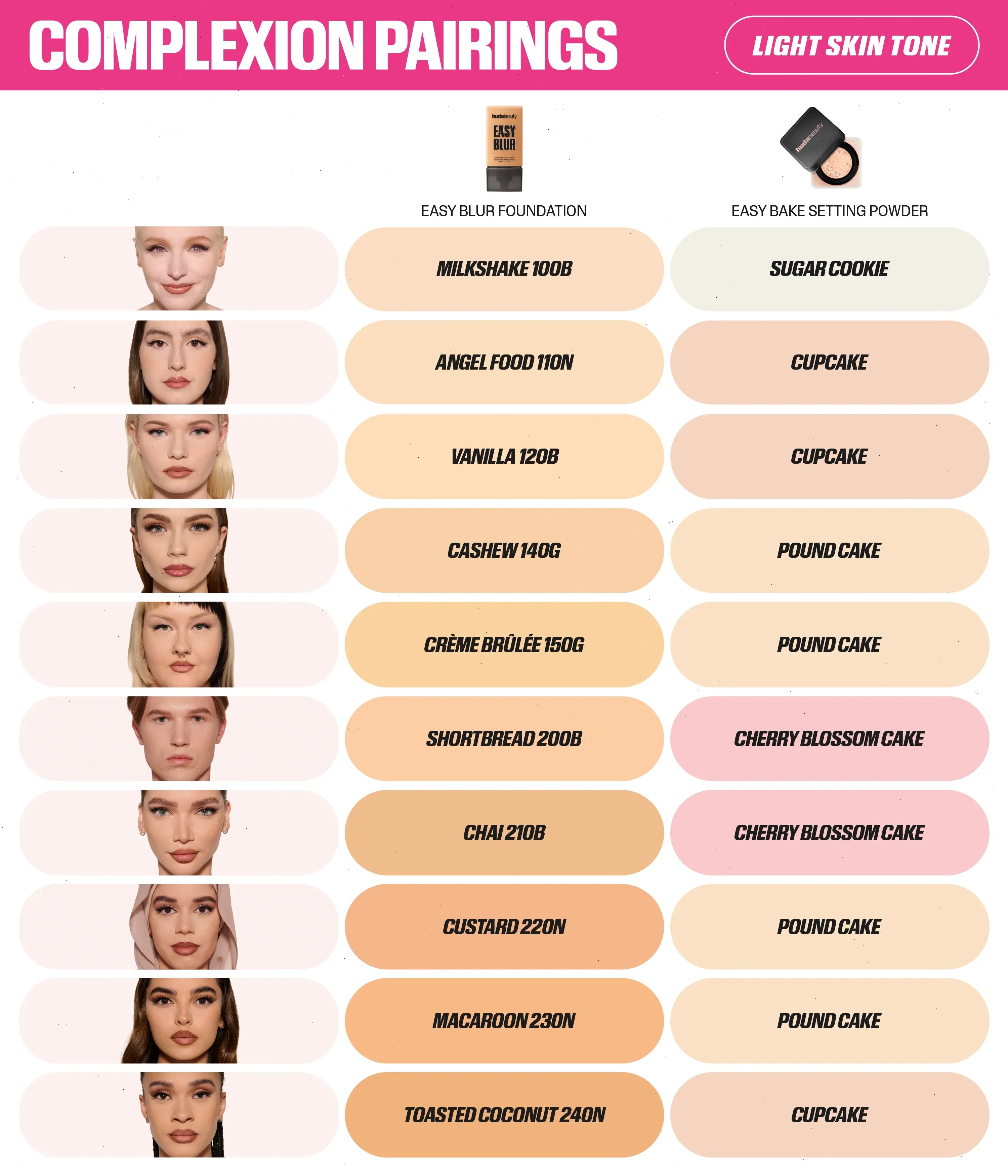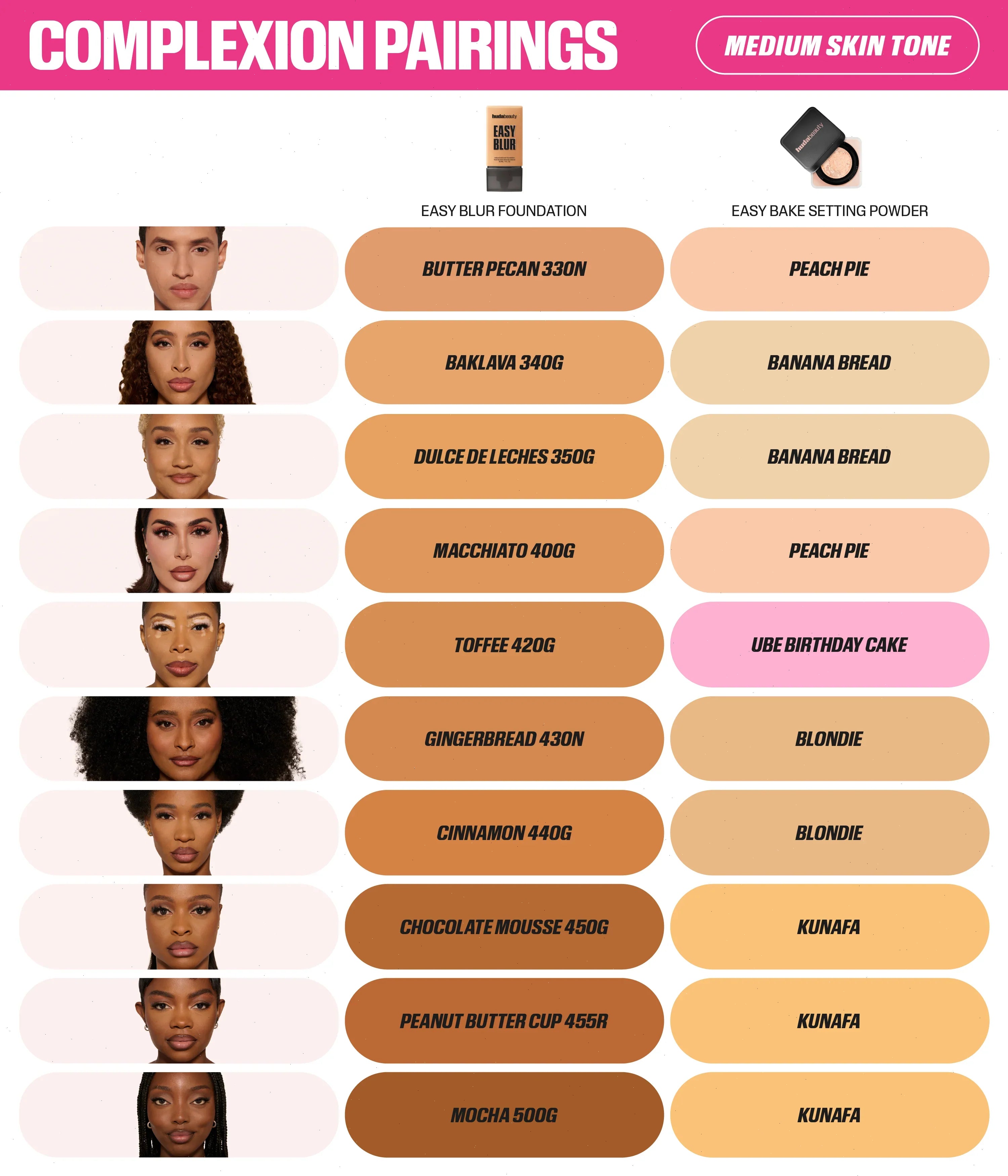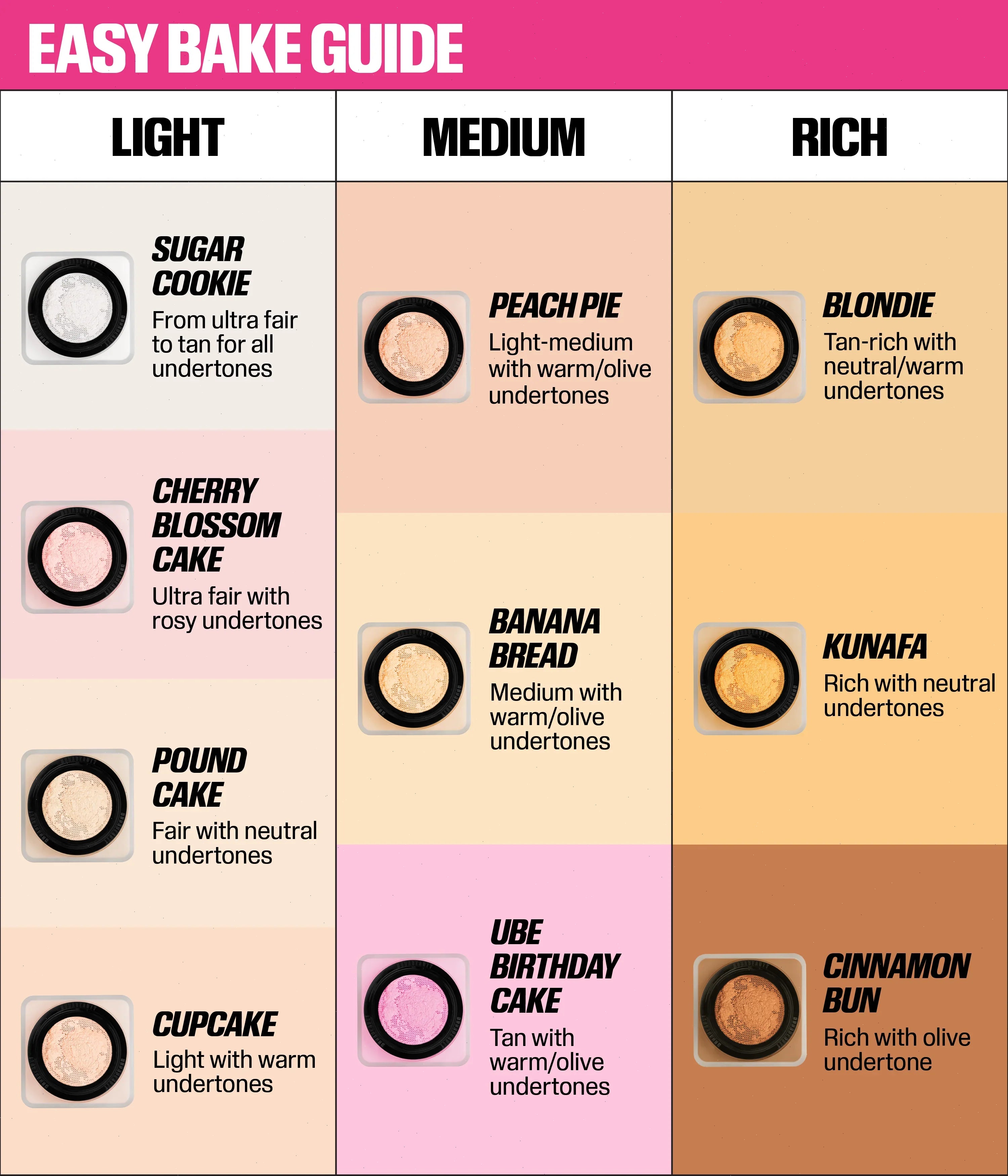 The Huda Beauty Easy Bake Loose Powders are inspired by Huda’s strong belief that the technique of baking is a key step to a flawless finish while ensuring long-lasting, melt-proof makeup. This extremely light and silky texture blends seamlessly into the skin leaving it matte with a hint of sheen, for a luminous finish that controls shine throughout the day. The powders work to subtly color correct and highlight different contours of the face, leaving a translucent veil of color on your skin.